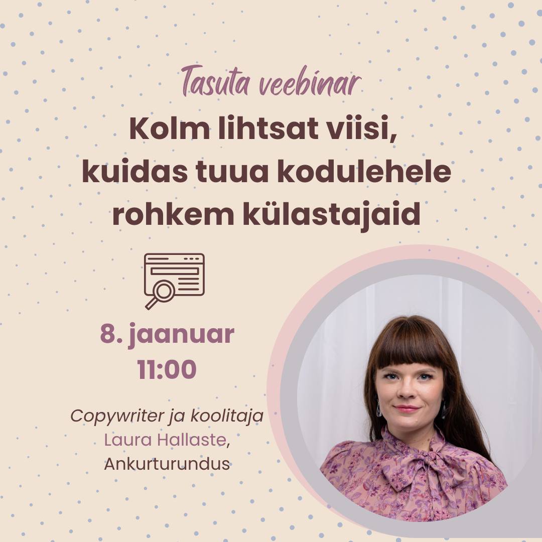 Kuidas saada kodulehele rohkem liiklust, ilma et peaksid selleks tasulist reklaami tegema? Veebinaril räägime, millised kolm lihtsat nippi aitavad kodulehele järjepidevalt külastajaid tuua — ka siis, kui sa ei jaksa pidevalt postititada või uusi kampaaniaid käima tõmmata.